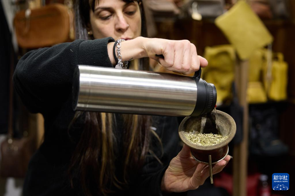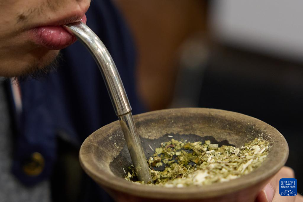 5月20日,一名游客在阿根廷布宜诺斯艾利斯品尝马黛茶。