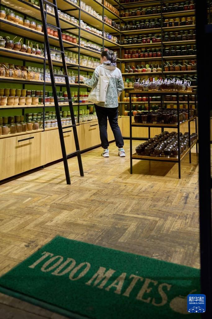 5月20日,一名游客在阿根廷布宜诺斯艾利斯挑选马黛茶杯。