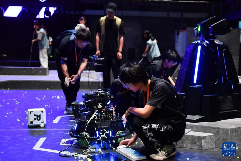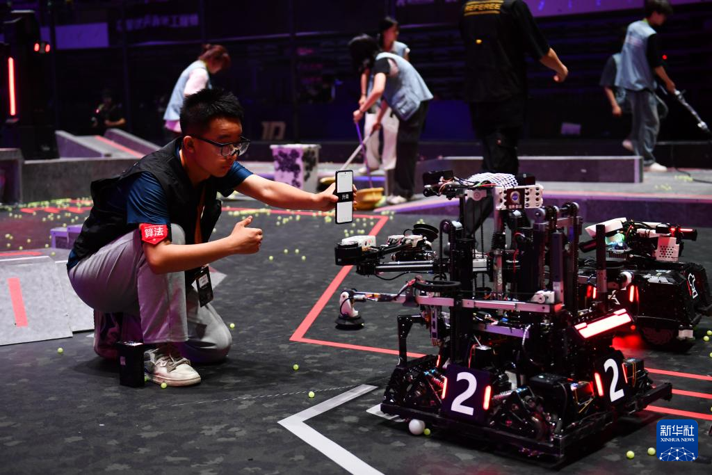 5月21日,合肥工业大学苍穹战队队员在比赛间隙调试机器人。