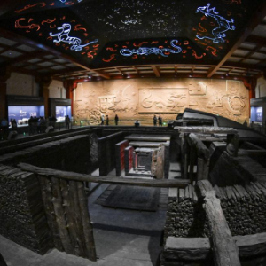 一号墓展区完整展示了汉代“梓宫、便房、黄肠题凑”(由后至前)葬制(5月20日摄)。