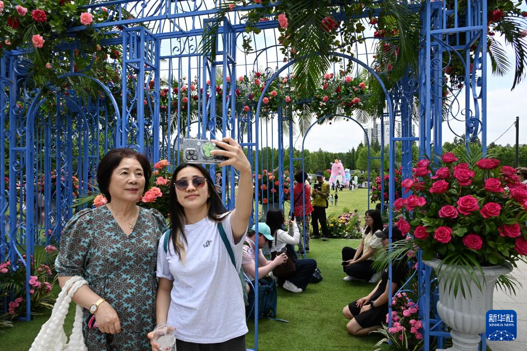 5月22日,在韩国首尔,游客与园艺作品合影。