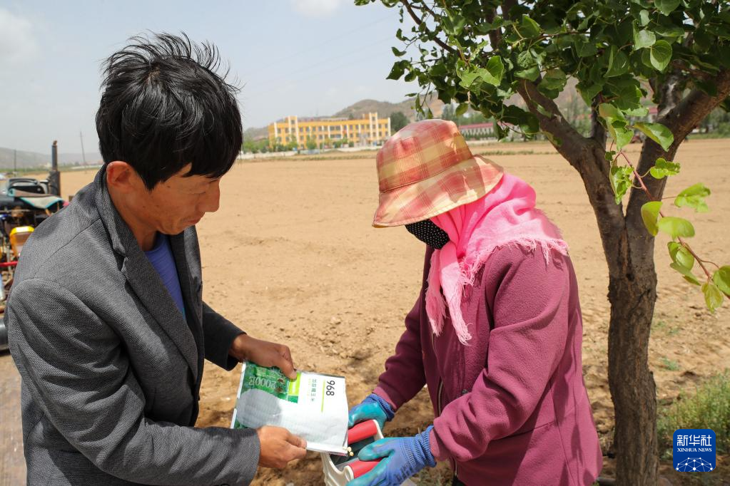 5月22日,在环县曲子镇五里桥村,环县农业农村局农技人员(左一)指导村民播种秋粮。