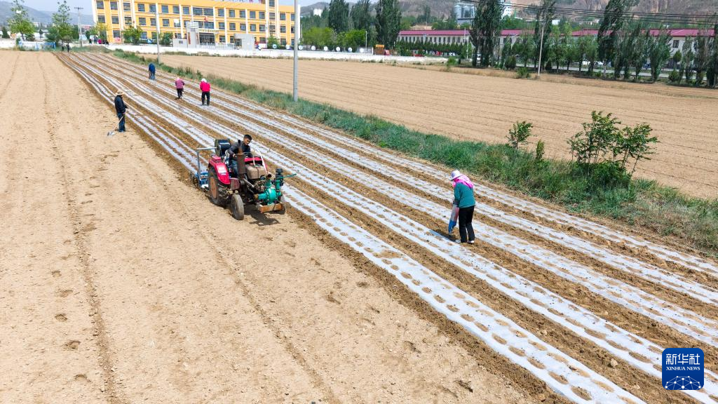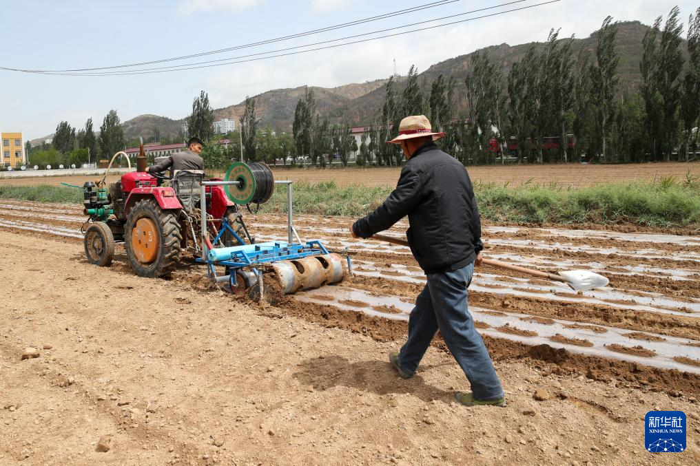 5月22日,在环县曲子镇五里桥村,村民对农田实施机械覆膜保墒作业。