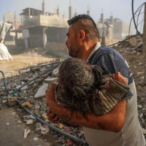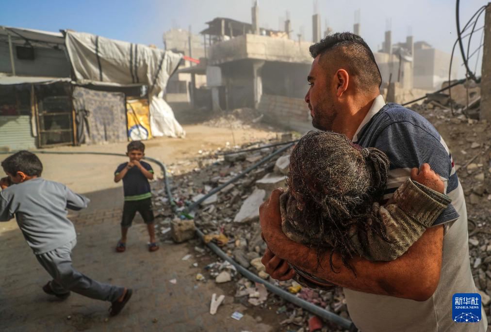 5月21日,在以军空袭加沙地带北部杰巴利耶难民营所在区域后,一名男子抱着受伤的女孩寻求救援。