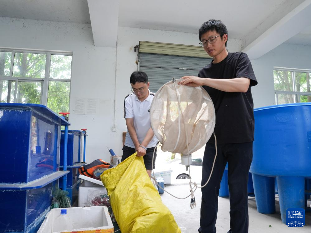 喻燚(右)和同事在四川省农业科学院水产研究所整理出差的工具(5月6日摄)。