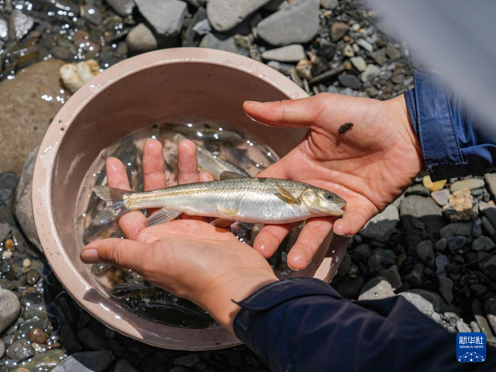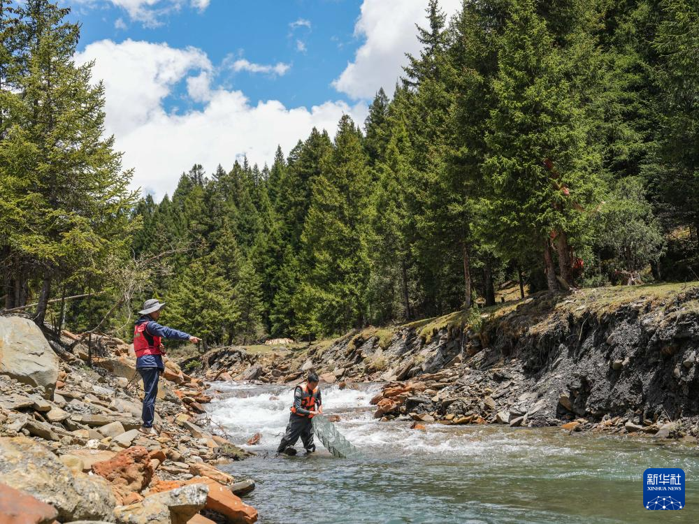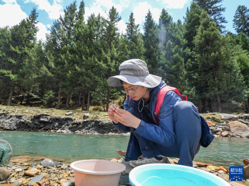 喻燚(前)在四川省阿坝州松潘县岷江支流牟尼沟为保留的渔获物活体标本换水换氧(5月20日摄)。