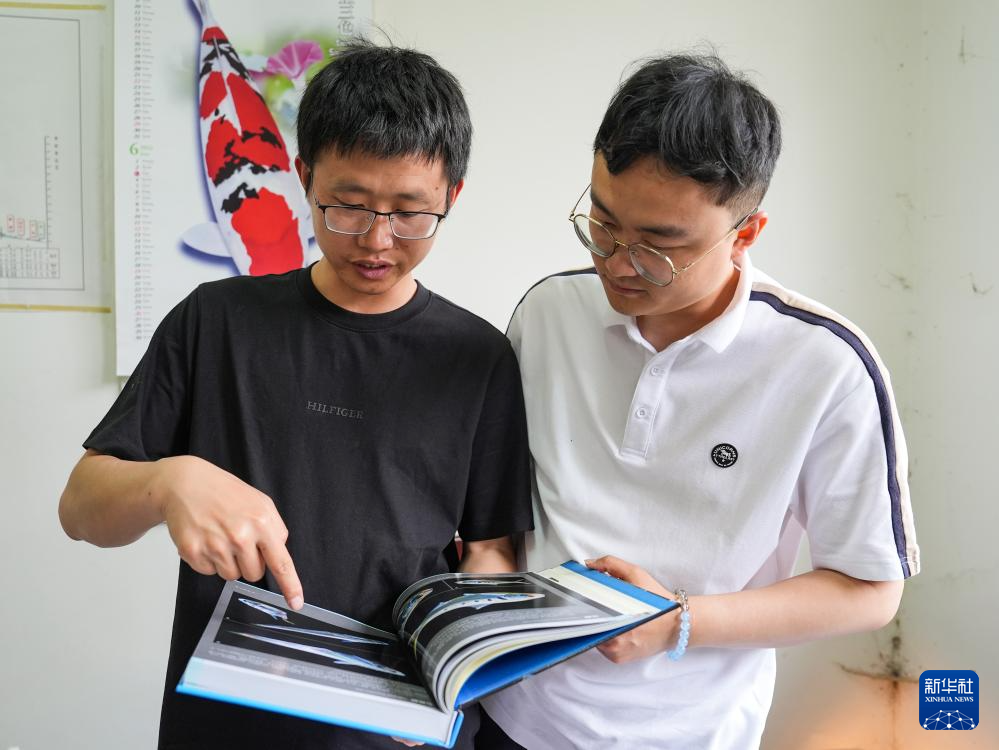 喻燚(左)和同事在四川省农业科学院水产研究所交流鱼类分类问题(5月6日摄)。