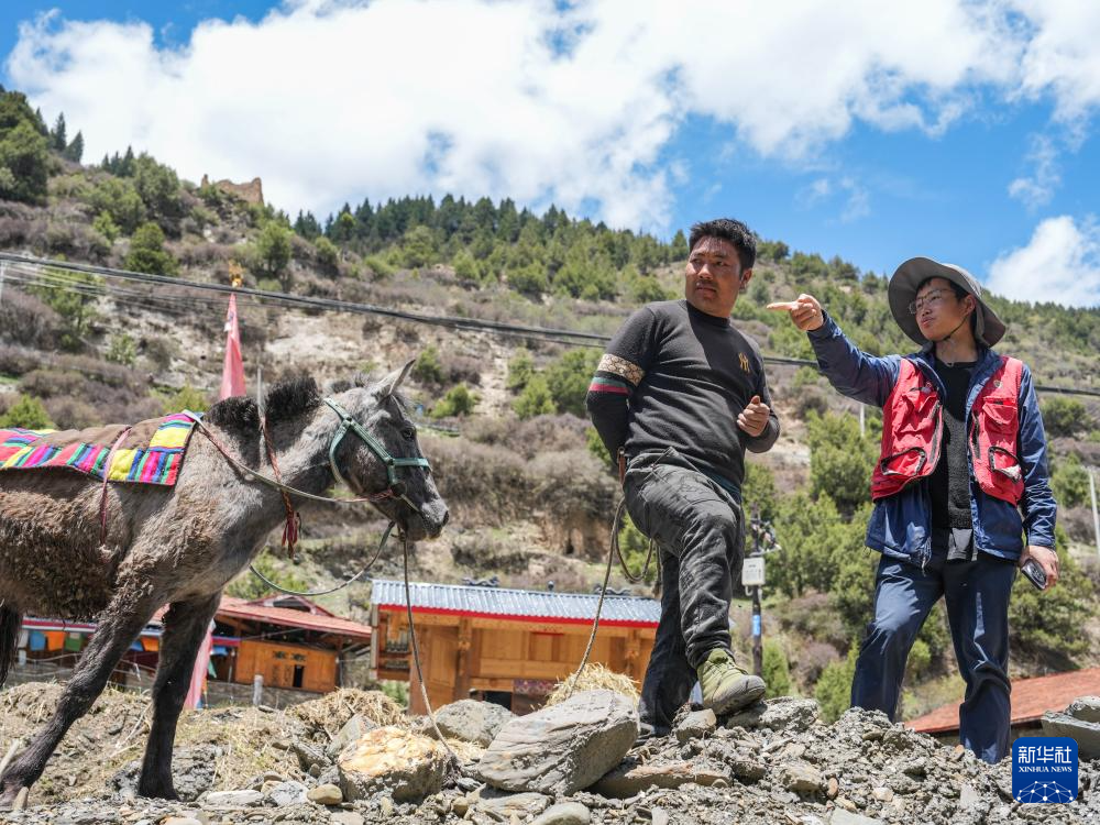 在四川省阿坝州松潘县岷江支流纳咪沟,喻燚(右)和当地村民交流当地鱼类资源情况(5月20日摄)。