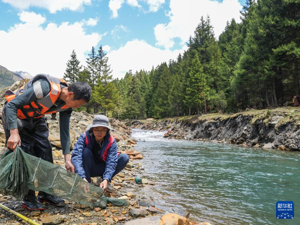喻燚(右)在四川省阿坝州松潘县岷江支流纳咪沟查看地笼里的渔获物(5月20日摄)。