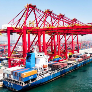 5月20日,在山东港口日照港集装箱码头,满载集装箱的船舶驶离港口。