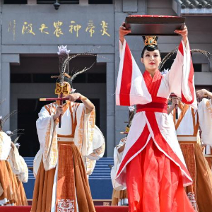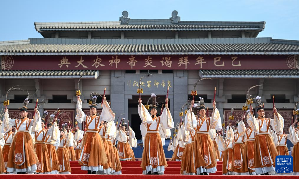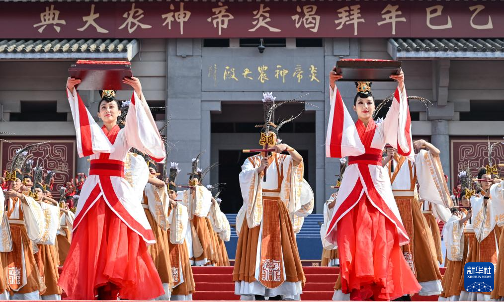 5月23日,演员在乙巳年世界华人炎帝故里寻根节上行“三献礼”,以“享酒”“五谷”“玉帛”祭祀炎帝。