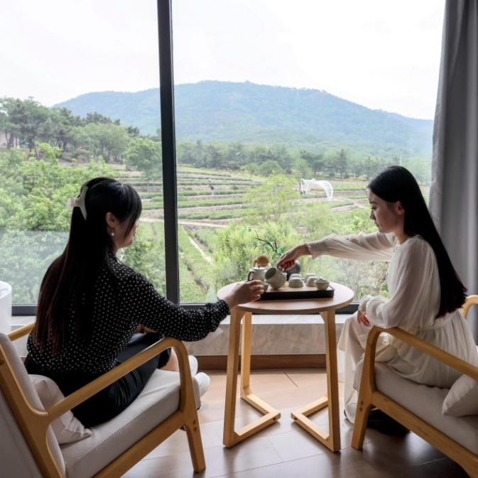 5月22日,游客在日照市岚山区“北门外1966”茶园内品茶。