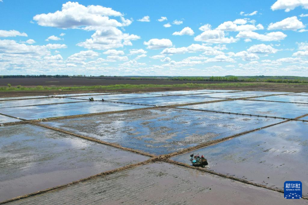 5月21日,北大荒集团建设农场有限公司第四管理区水稻种植户驾驶搭载北斗卫星导航辅助直行系统的高速插秧机进行插秧作业(无人机照片)。