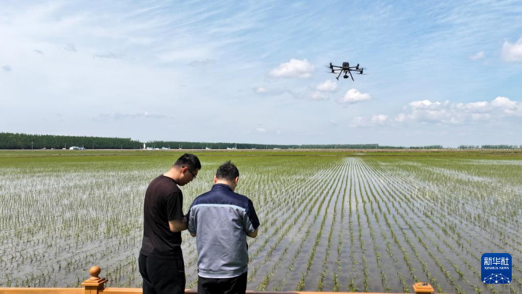 5月21日,在北大荒集团黑龙江绥滨农场有限公司东井管理区,操作员操控搭载北斗导航系统的植保无人机对即将施返青肥的地块进行打点。