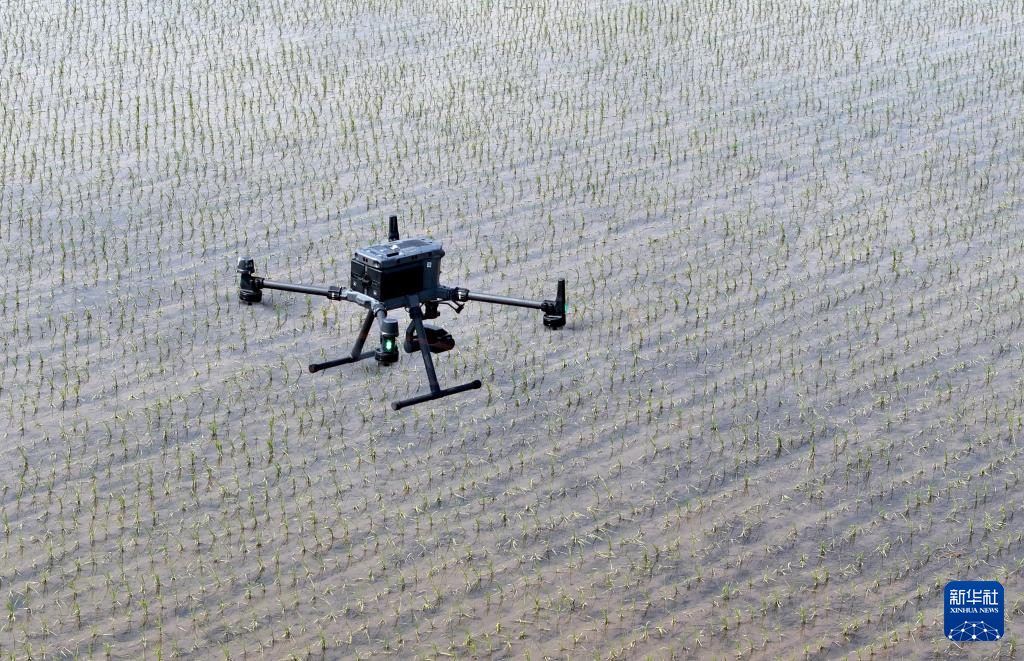 5月21日,在黑龙江北大荒农业股份八五六分公司第六管理区农业现代化示范区,搭载多光谱、可见光摄像头的无人机对水稻插秧后田块进行土壤墒情监测(无人机照片)。