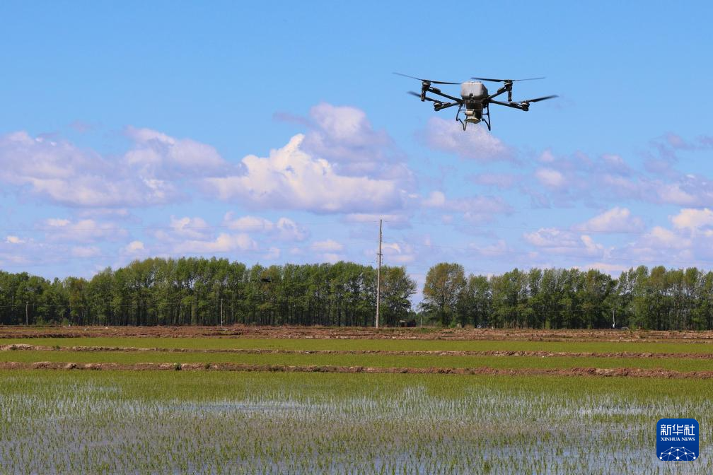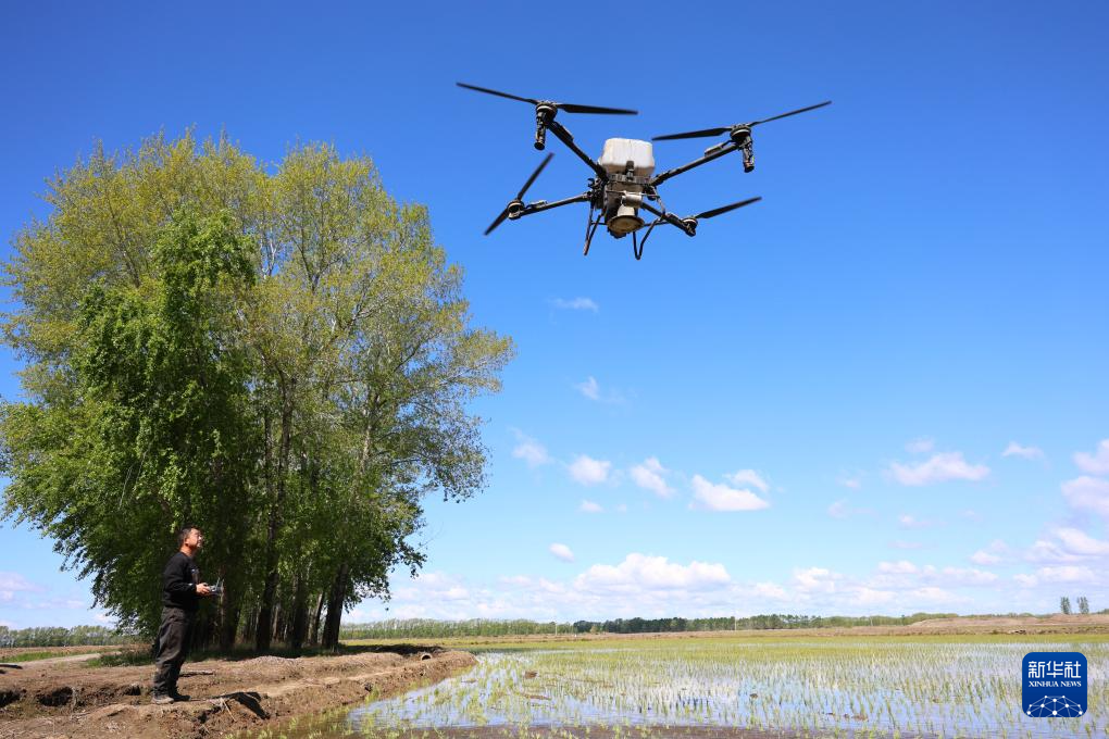 5月21日,在北大荒集团黑龙江绥滨农场有限公司东井管理区,搭载北斗导航系统的植保无人机对水田地块施撒返青专用肥。