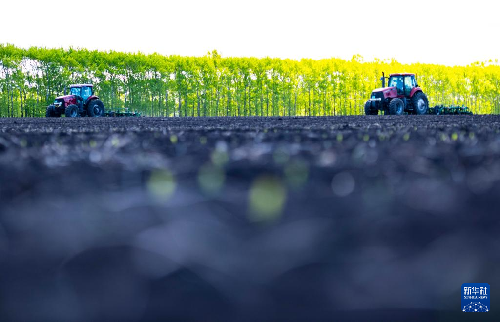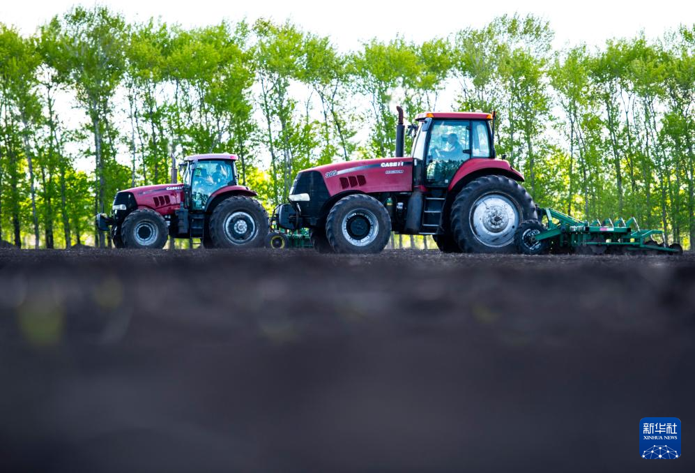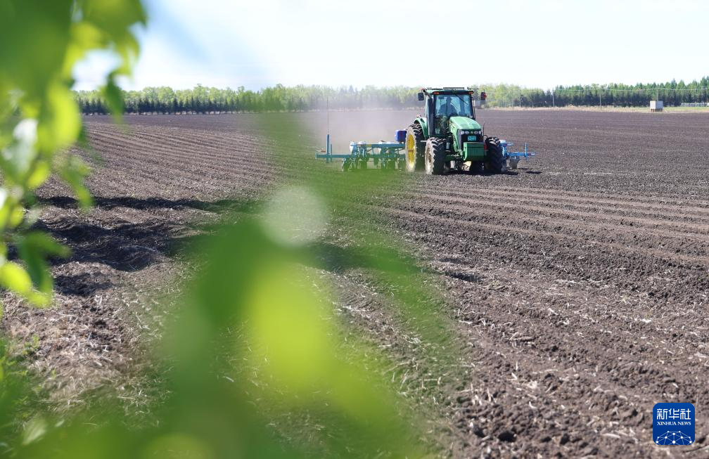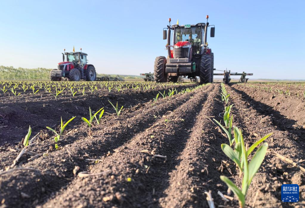 5月23日,在北大荒集团黑龙江建设农场有限公司第三管理区,农机工人驾驶搭载北斗卫星导航自动系统的大型中耕深松机械,对刚出苗的玉米地块进行深松放寒作业。