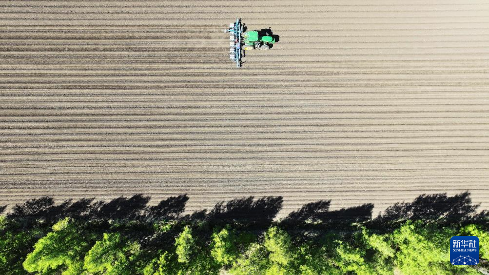 5月21日,在北大荒集团黑龙江红星农场有限公司有机大豆地块,搭载着北斗卫星导航精准作业系统的大马力机车进行播种作业(无人机照片)。