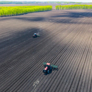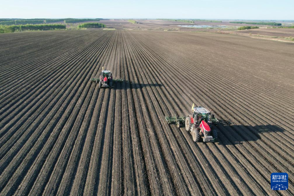 5月23日,在北大荒集团黑龙江建设农场有限公司第三管理区,农机工人驾驶搭载北斗卫星导航自动系统的大型中耕深松机械,对刚出苗的玉米地块进行深松放寒作业(无人机照片)。