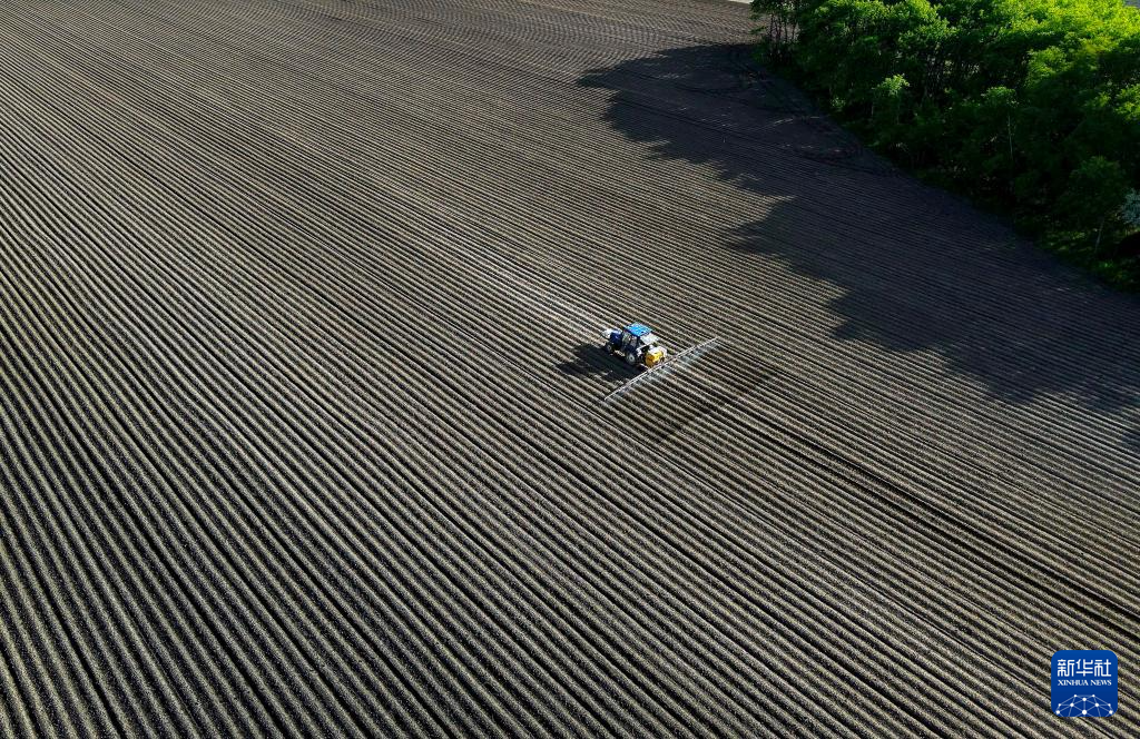 5月21日,在北大荒农业股份有限公司八五六分公司第四管理区,搭载北斗卫星导航精准作业系统的机车喷施除草药(无人机照片)。