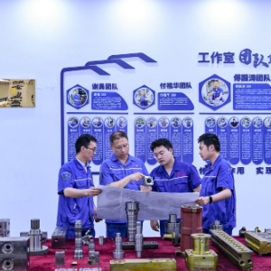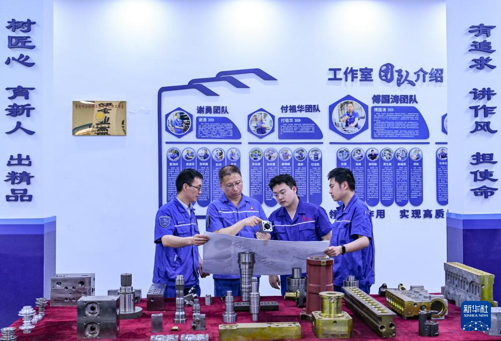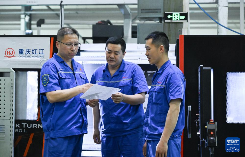 5月23日,傅国涛(左二)在重庆红江机械有限责任公司技能大师工作室与同事交流。