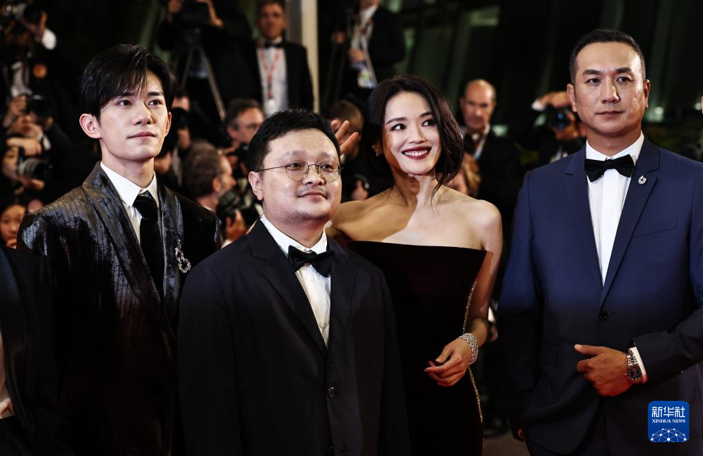 5月22日,在法国南部小城戛纳举行的第78届戛纳国际电影节上,导演毕赣(中)和演员舒淇(右二)、易烊千玺(左一)、黄觉(右一)出席影片《狂野时代》首映礼。