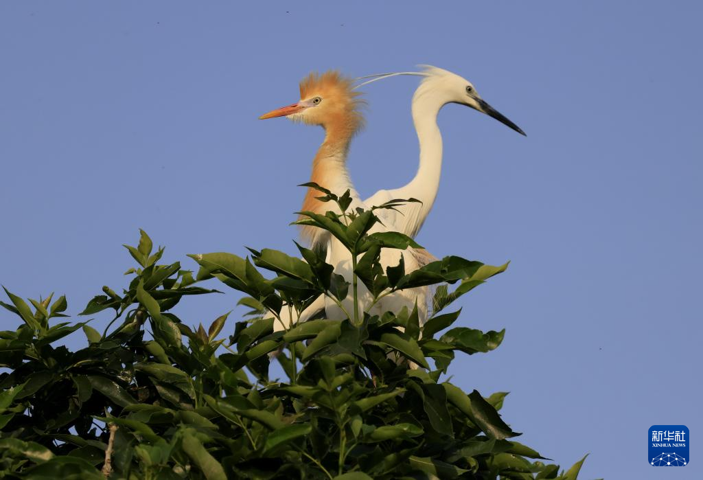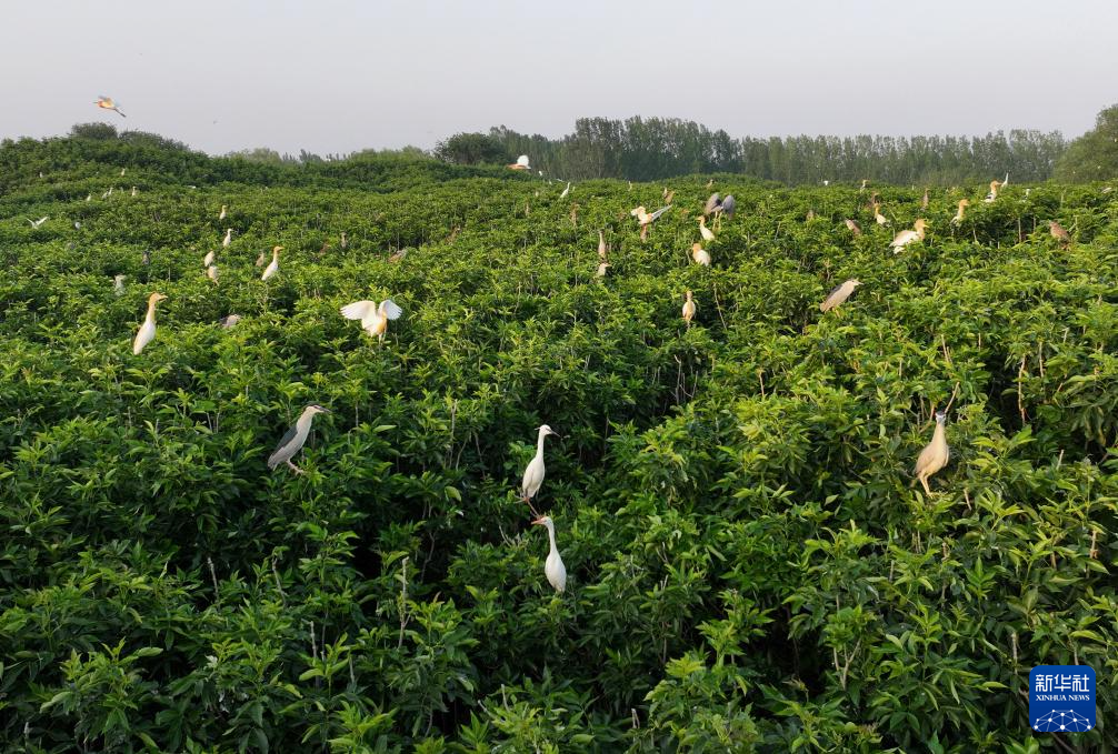 近日,河北省唐山市丰南区生态环境优良的沿海林地吸引了大批白鹭、牛背鹭、夜鹭和苍鹭等鹭科鸟类在此栖息繁衍,绘就出一幅幅优美和谐的生态画卷。