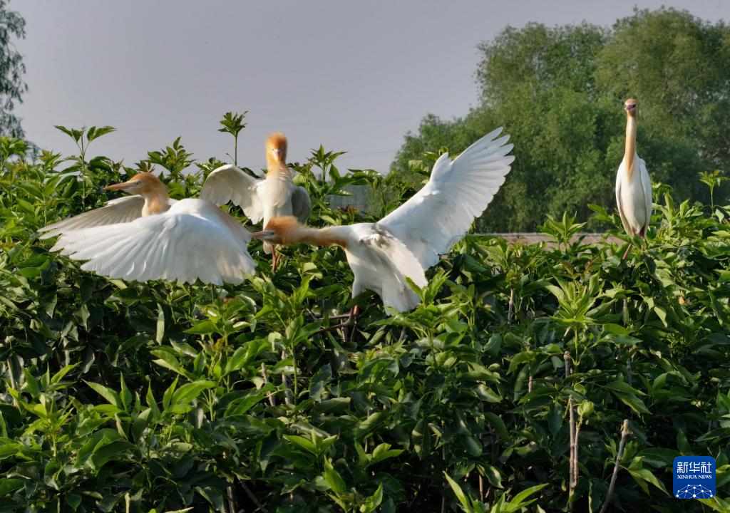 5月24日,三只牛背鹭在唐山市丰南区沿海林地的树上嬉戏。