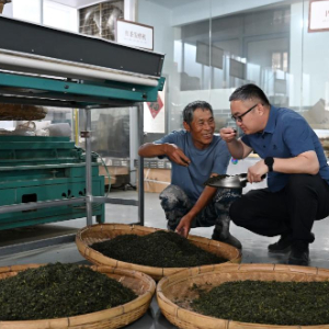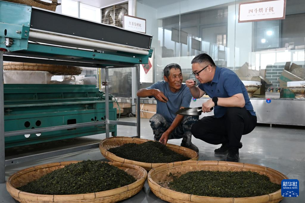 5月25日,在五莲县丁家楼子村,第一书记郑勇山(右)在村里的茶叶合作社查看茶叶品质。