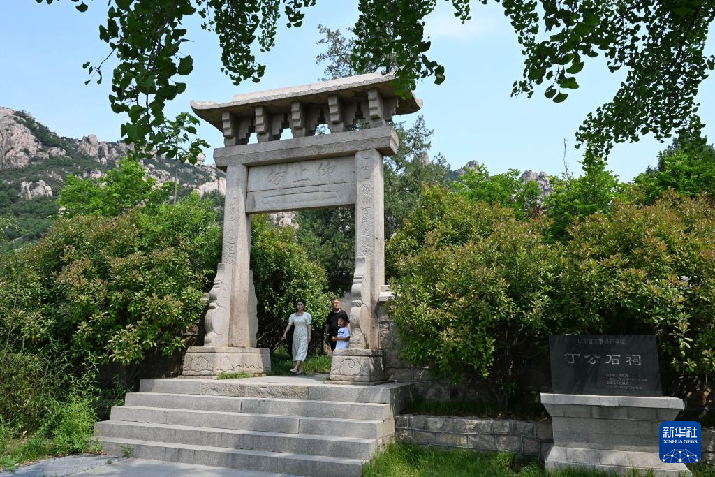 5月25日,在五莲县丁家楼子村,游客参观丁公石祠。