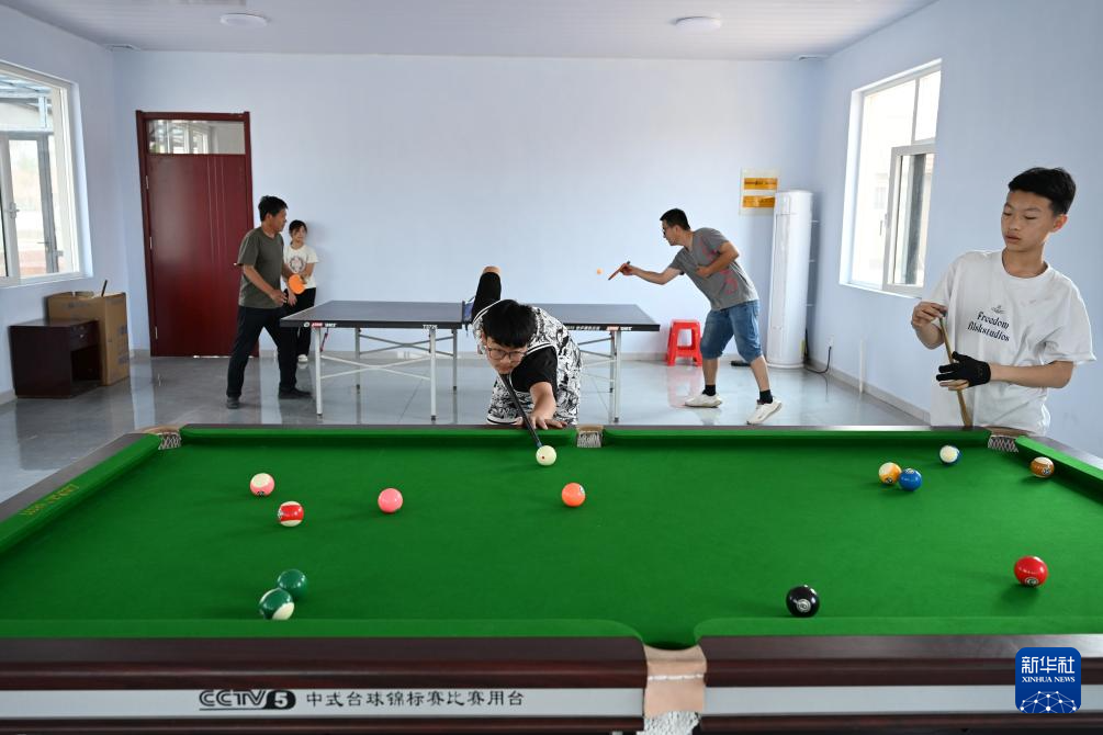 5月25日,在五莲县许孟镇曹家屯村,村民在刚刚建成的民生综合体村民活动室内打球。