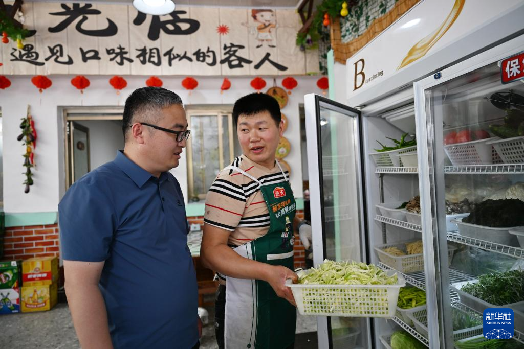 5月25日,在五莲县丁家楼子村,第一书记郑勇山和返乡经营农家乐的“85后”丁金伟交流。