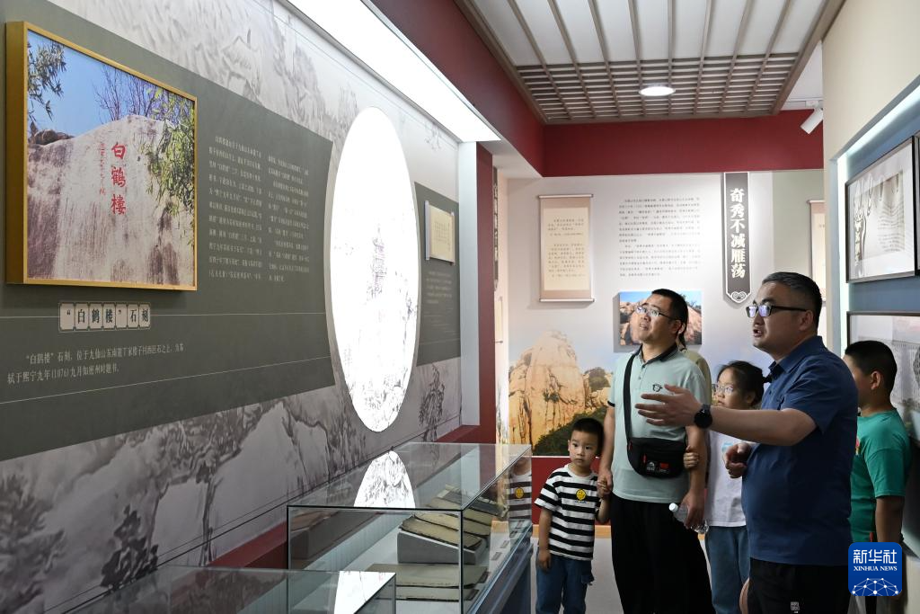 5月25日,在五莲县丁家楼子村新建的白鹤楼书院,第一书记郑勇山为游客介绍村里的白鹤楼题刻。