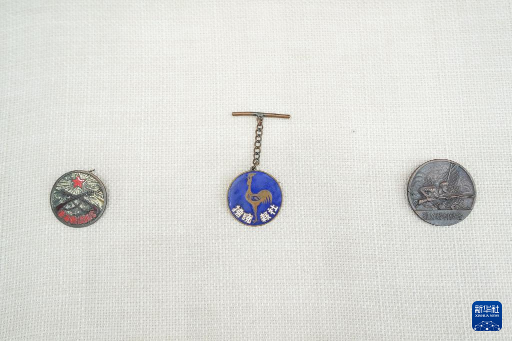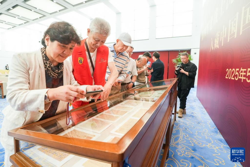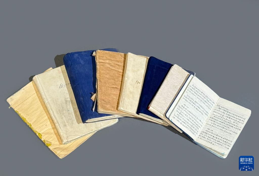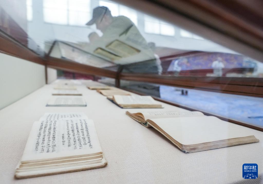 参观者在仪式现场观看新四军老战士沈如峰的战地日记等物品(5月26日摄)。