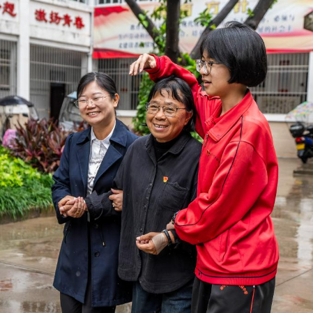 5月27日,一名华坪女高学生(右)用手给张桂梅(中)挡雨。
