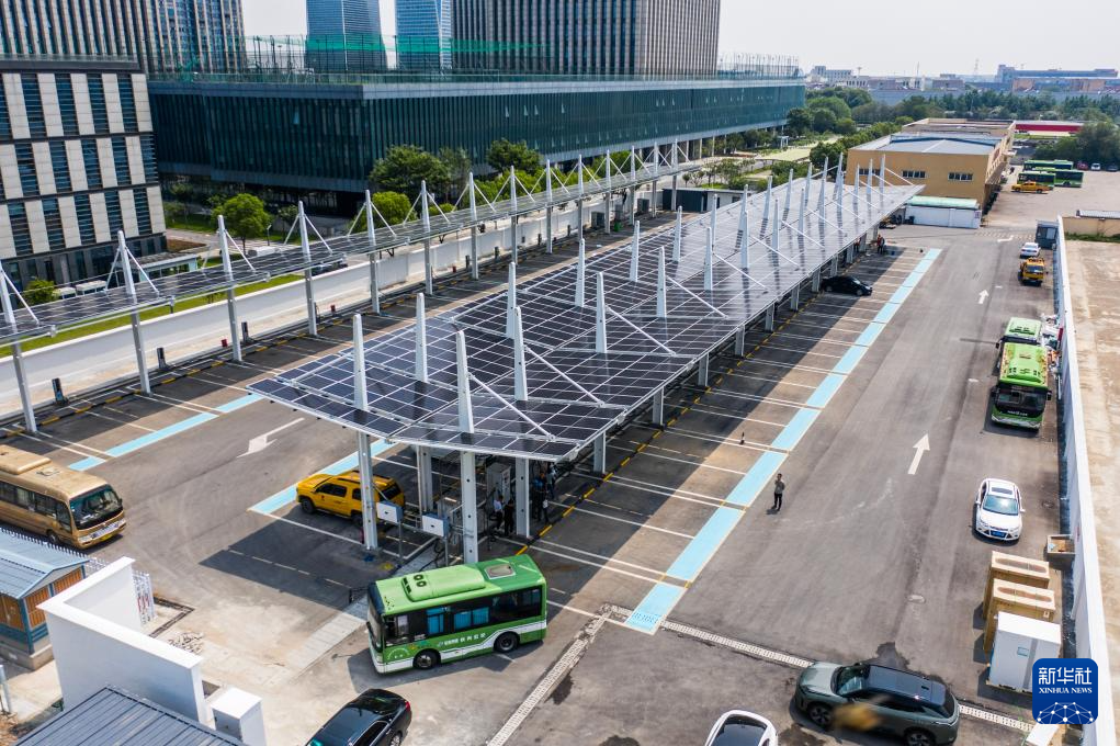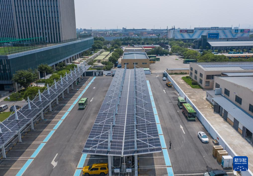 5月27日拍摄的湖州长兴公交总站光储充一体化公交充电站(无人机照片)。
