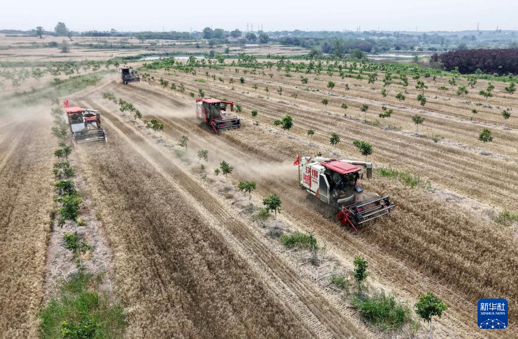 5月27日,在安徽省亳州市蒙城县小辛集乡麦田,农民利用收割机抢收小麦(无人机照片)。