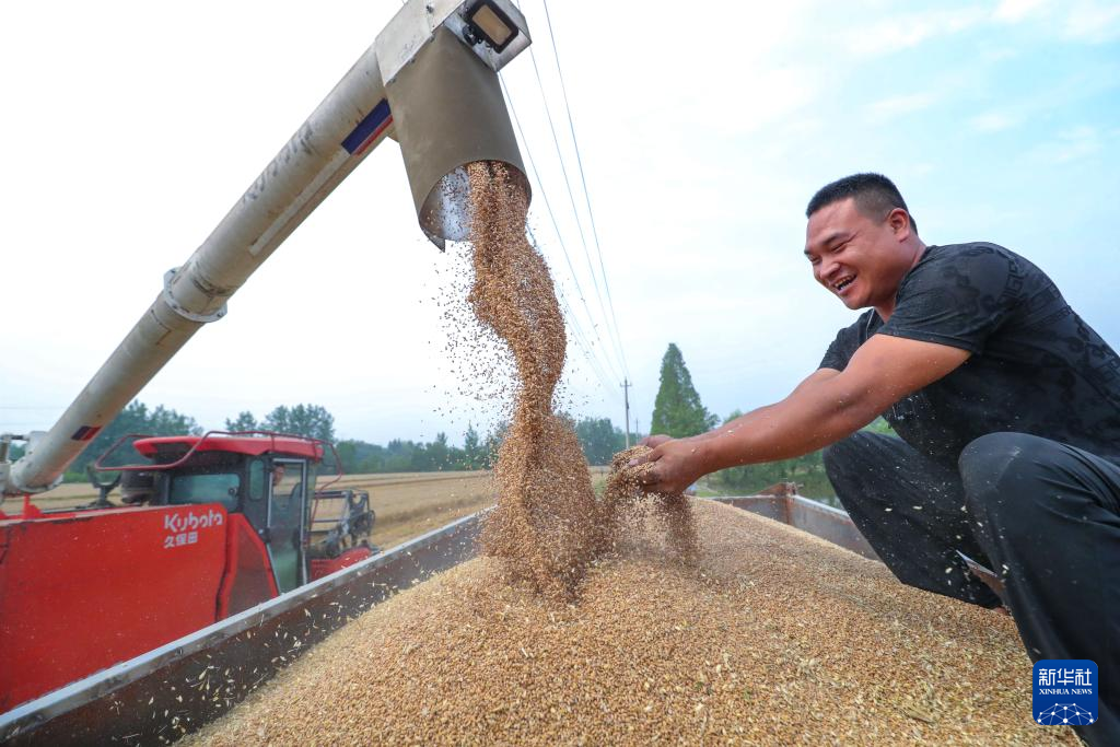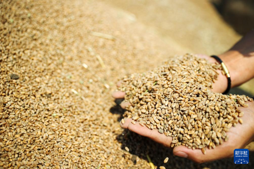 5月26日,农民在浙江省湖州市吴兴区东林镇保国村查看收获的小麦。
