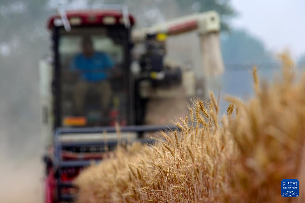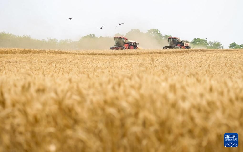 5月26日,联合收割机在河南省许昌市建安区陈曹乡高标准粮田示范园区收割小麦。