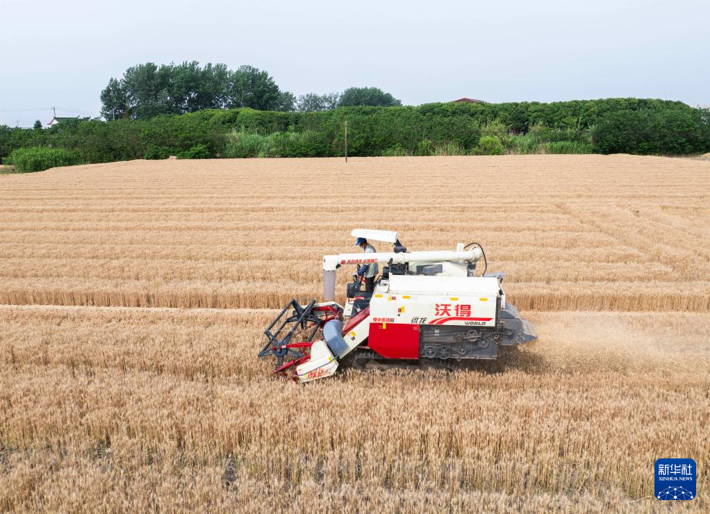 5月27日,农民驾驶收割机在江苏省句容市茅山镇何庄村收割小麦。