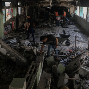 5月26日,人们在加沙城一处以军袭击后的建筑废墟中清理物品。