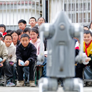 5月28日,在昭通市大关县翠华镇庆云小学,学生们与四足机器人互动。