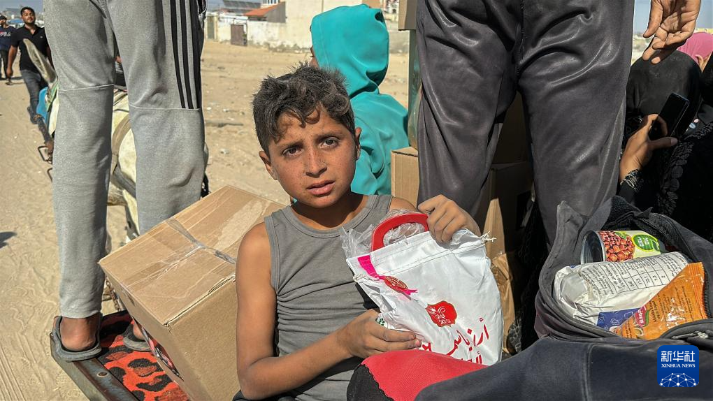 5月27日,在加沙地带南部城市拉法,一名儿童从“加沙人道主义基金会”运营的一个物资分发中心领取救援物资(手机照片)。