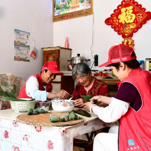 5月28日,在菏泽市郓城县郓州街道大樊庄村,居家养老服务中心的工作人员与建档立卡特困老人侯爱菊一起包粽子。