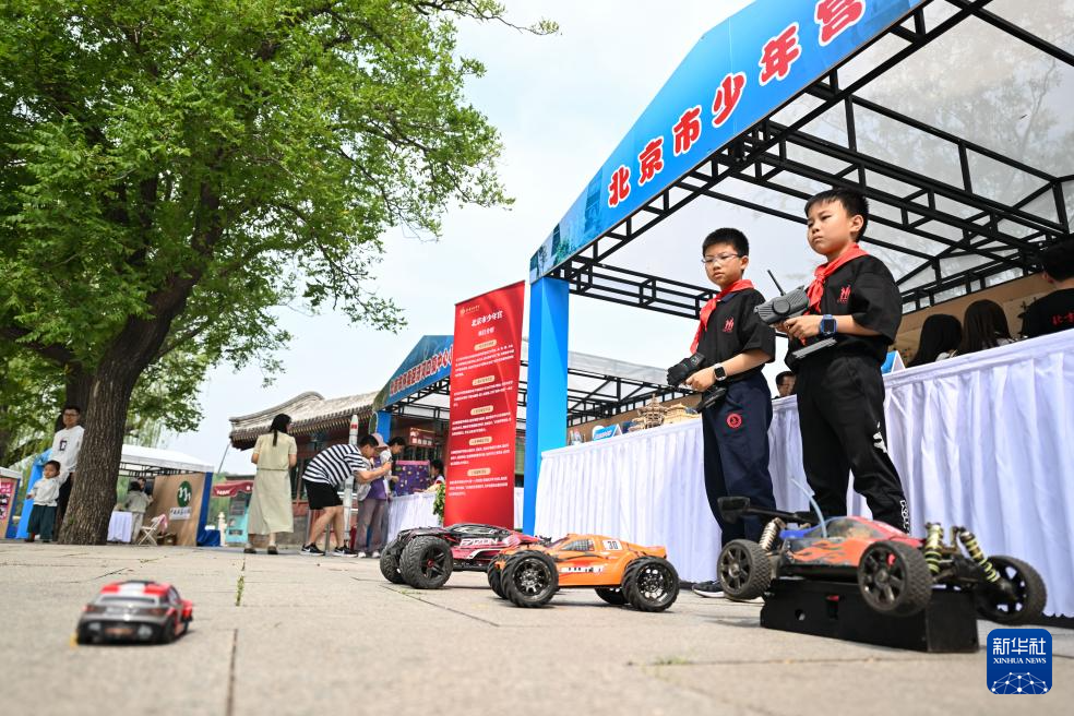 5月29日,北京市少年宫车辆模型社团成员在活动中操控车模。