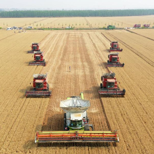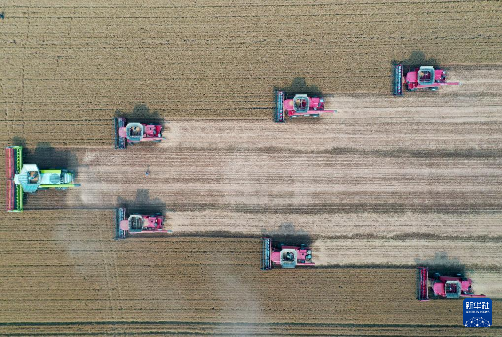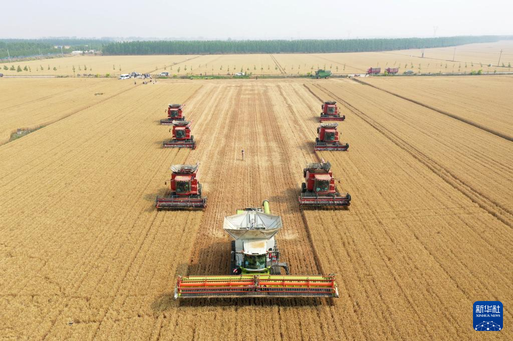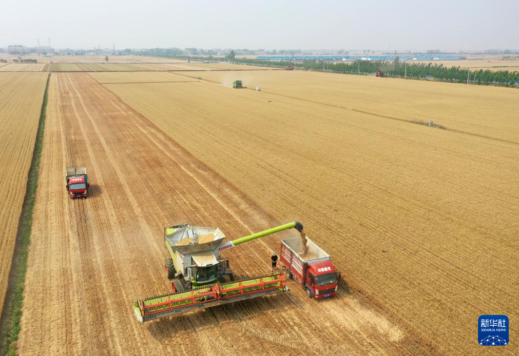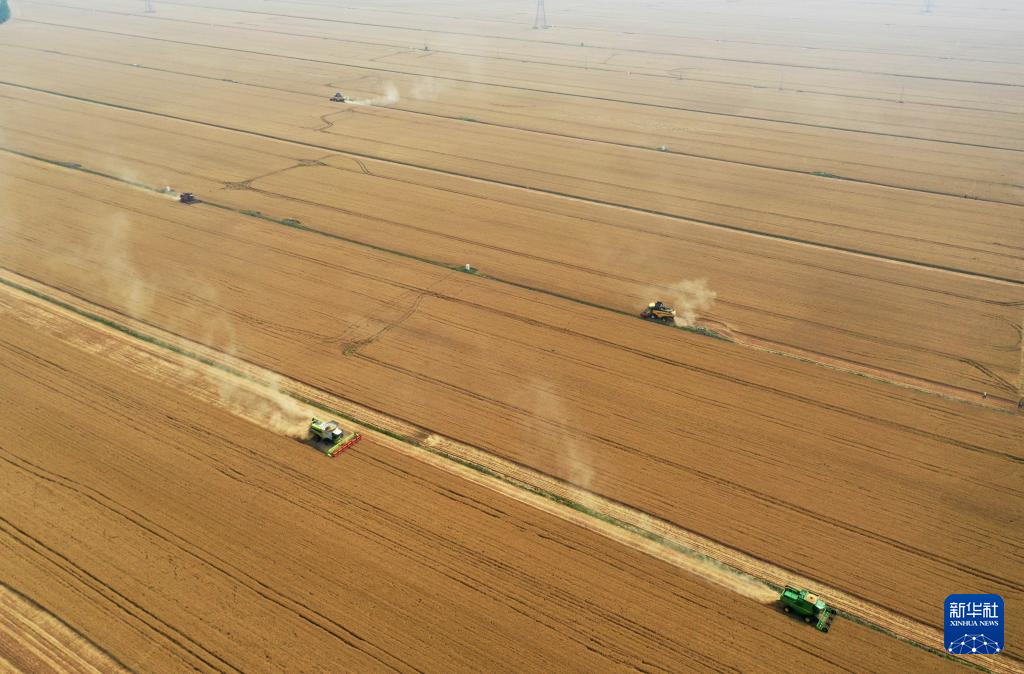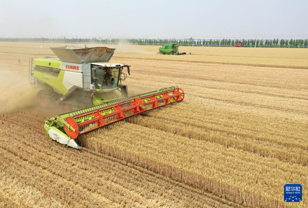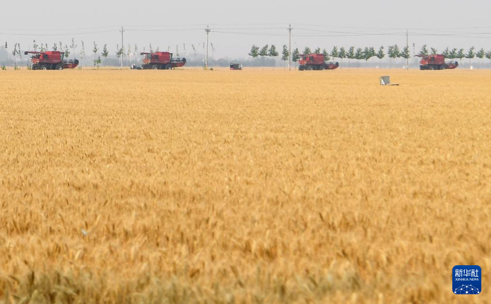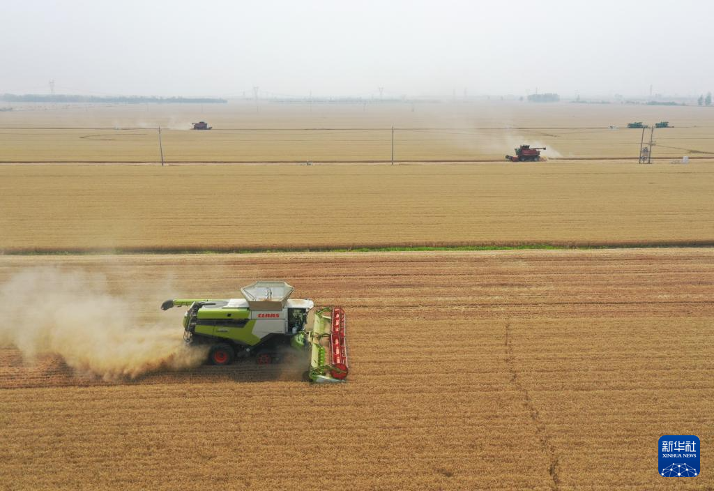 “三夏”时节,河南省周口市西华县黄泛区农场内农机轰鸣,大型联合收割机在麦田里穿梭来往,工作人员紧抓晴好天气抢收小麦,确保颗粒归仓。
