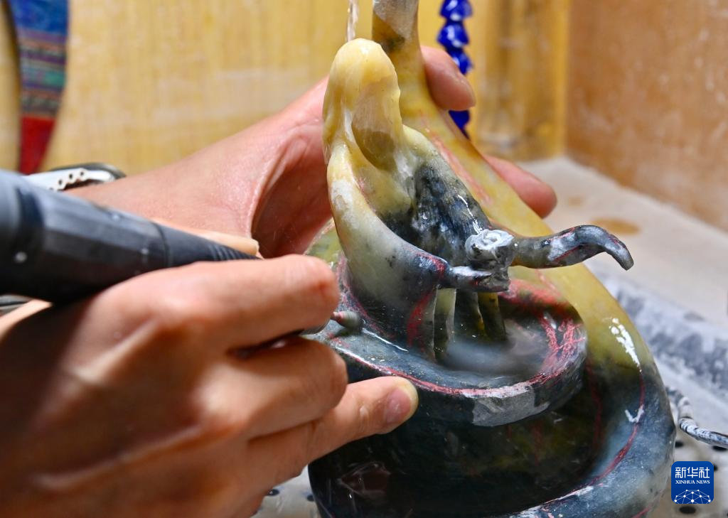5月20日,玉雕师在“玉三生”工作室内加工岫玉作品。