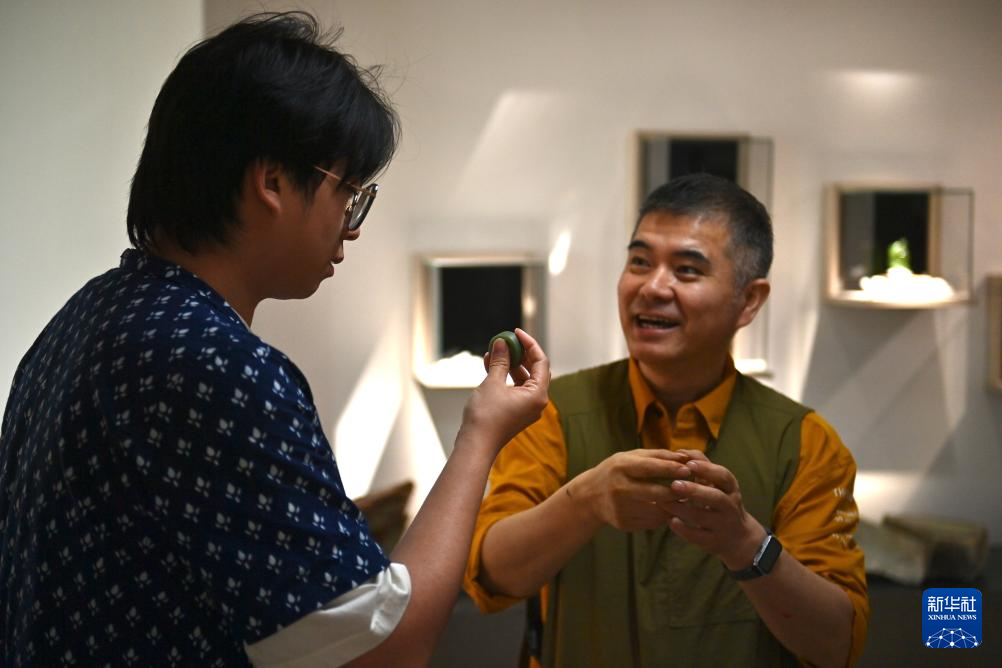 5月30日,唐校(左)在“玉三生”工作室内与玉雕师交流雕刻技艺。