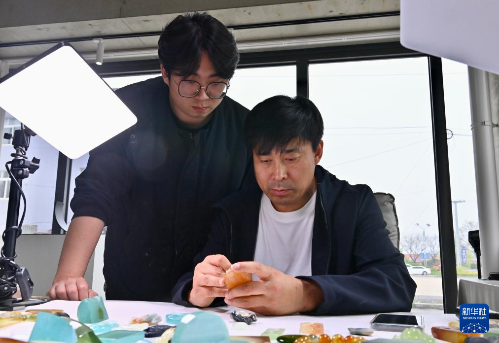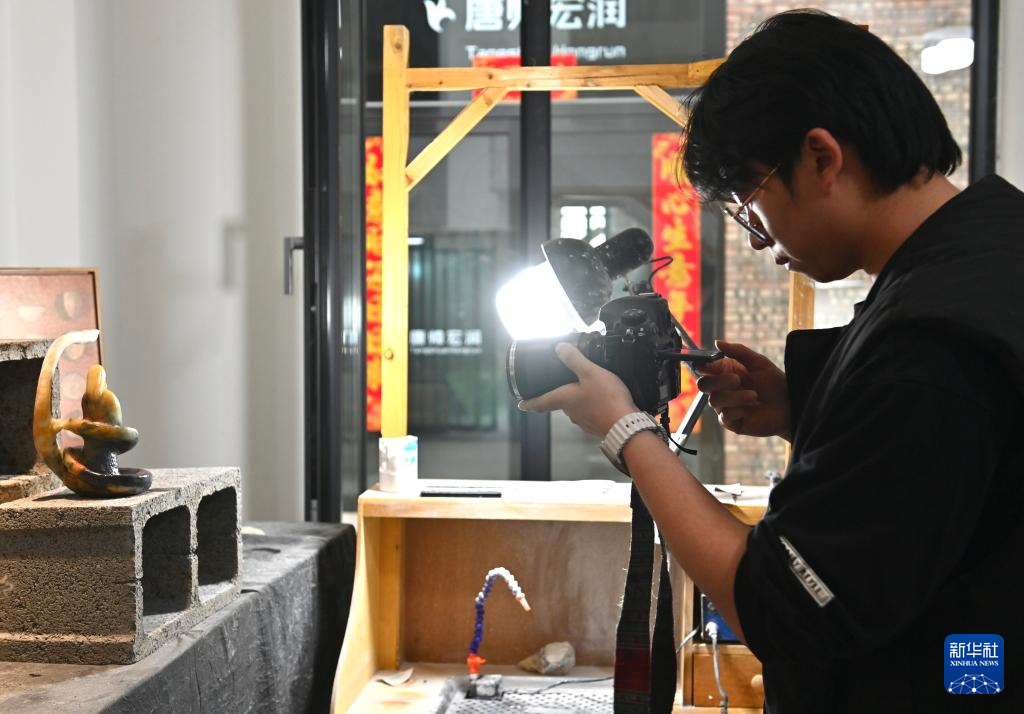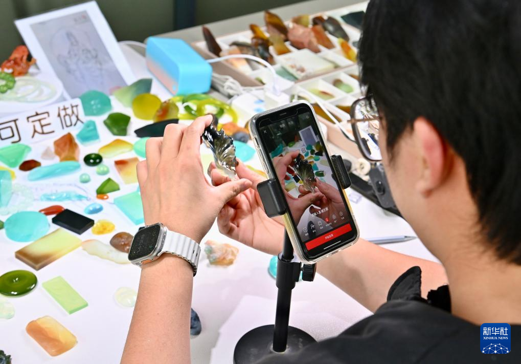 5月20日,唐校在“玉三生”工作室内拍摄岫玉作品,为客户展示制作进度。