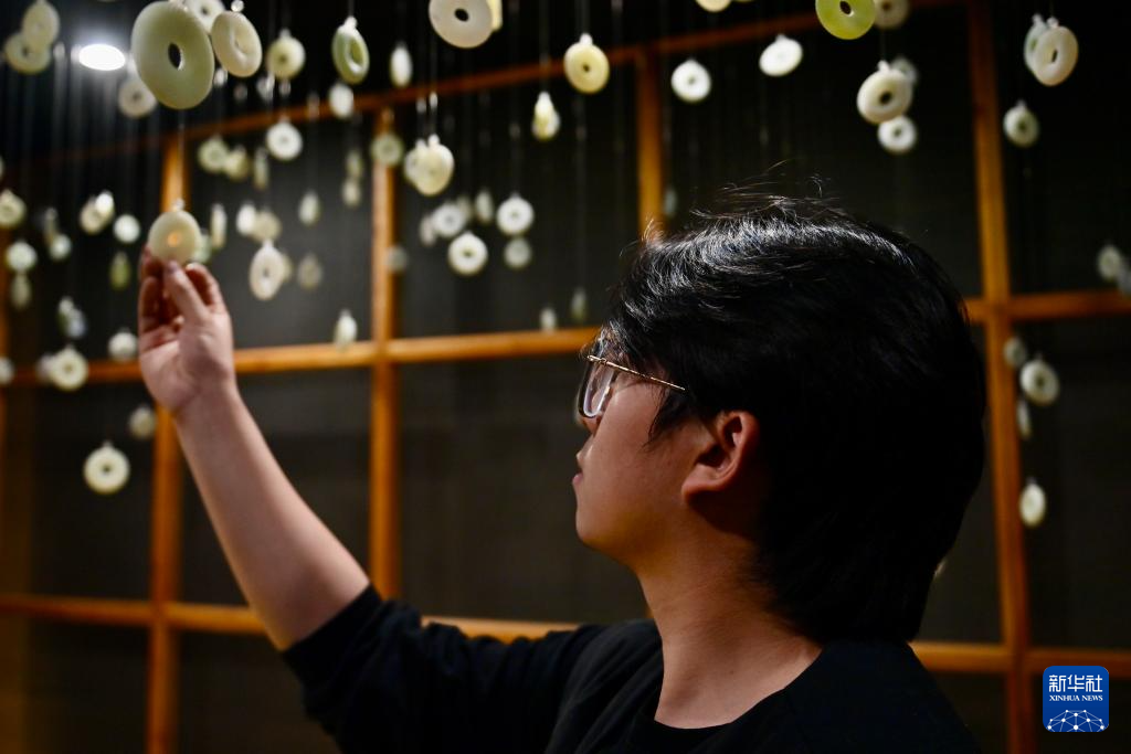 5月20日,唐校在“玉三生”工作室内展示一件融合了国潮元素的岫玉作品。